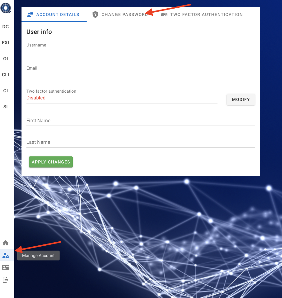 Go to the Manage Account tab (yellow arrow) and the select 2FA Two Factor Authentication (red allow). To enable 2FA click on the Enable 2FA (purple arrow) button and follow the instructions.